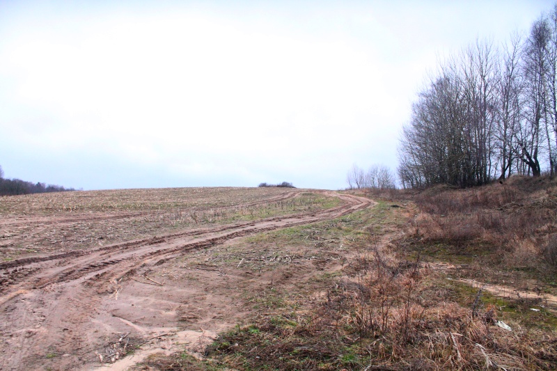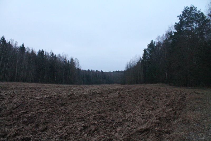 Ещё через 500 м по дороге я вышел к узкой, 50 м шириной, поляне, уходящей на юг на 400 м. Удивительно, но даже такой клочок земли был вспахан. Благо, дорога шла у леса на не была задета бороной, так что пройти дальше проблем не представляло. ![]() Вторая лесная поляна, вид на юг. Точка PS9.