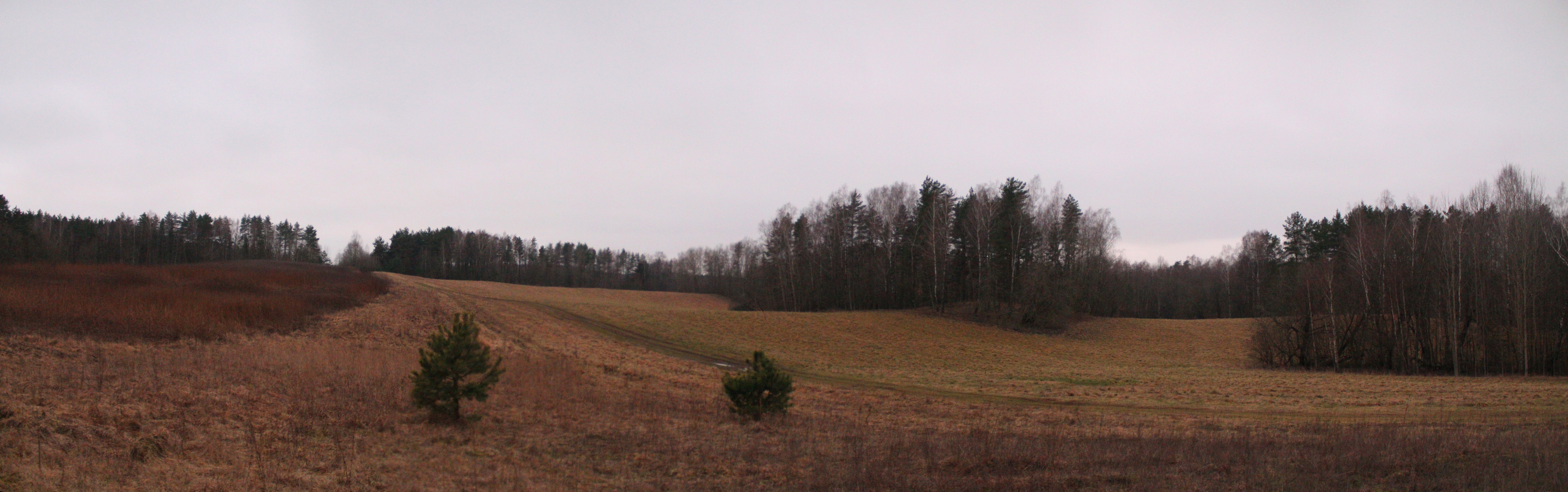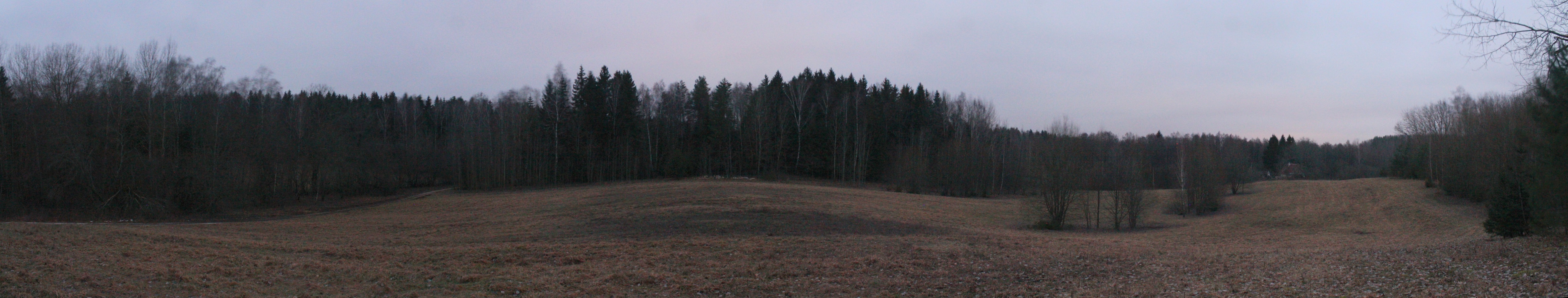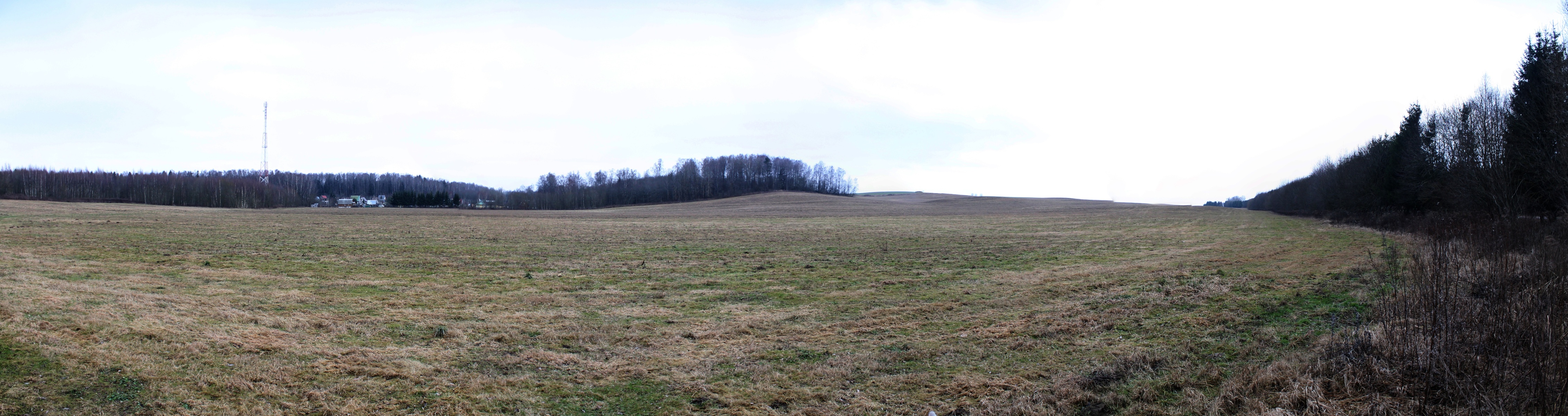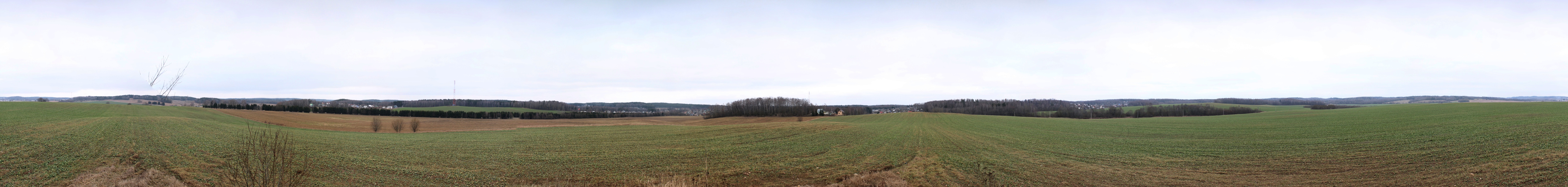 Погода была пасмурная, в конце января темнеет рано, так что я торопился успеть отснять панорамы холмов рядом со станцией. Пройдя около 900 м мимо садовых товариществ, я вышел к холмистым полям. К югу от шоссе открывалась панорама на восточную пологую оконечность поля PS. Панорама 180o восточной части поля PS, вид на юг. Точка PS3.