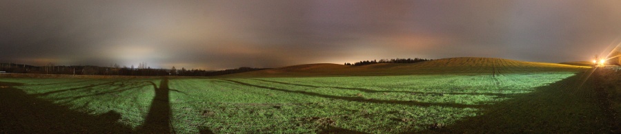 На этом же холме я испытал главное стрессовое переживание за эту одиссею. Пока делал панораму и подсвечивал фонариком поле, заметил пару светящихся глаз на отдалении. Глаза двигались, и двигалис на меня. По характеру движения стало понятно, что это совсем не котик из Эпимахов, и не зайчик с поля. Глаза медлено "прыгали", а у меня в воображении стала рисоваться картинка из "Собаки Баскервилей". Нужно было быстро соображать, как обороняться от возможно недружелюбно настроенного пёсика, но за метров 50 от меня, пока я пытался рассмотреть хозяина глазок, зверь резко повернул вбок и я увидел, что это была косуля. Хотя судя по поведению, вначале она вела себя как бабочка, летящая на свет. В общем, обошлось небольшим выбросом адреналина, и на том спасибо. После этого я направился через поле к шоссе Н8255, которое идёт от Эпимахов к г. Гиревичи на юго-восток. В Гиревичах я повернул на северо-восток -- это была самая дальняя точка этой одиссеи. После этого я стал медленно приближаться к ст. Радошковичи. За Гиревичами я свернул в ещё одно поле и снял его панораму, т.к. дальше дорога шла через леса и полей до самой станции не предвиделось. Панорама поля на север от д. Гиревичи, центр на северо-запад. Точка PS14.