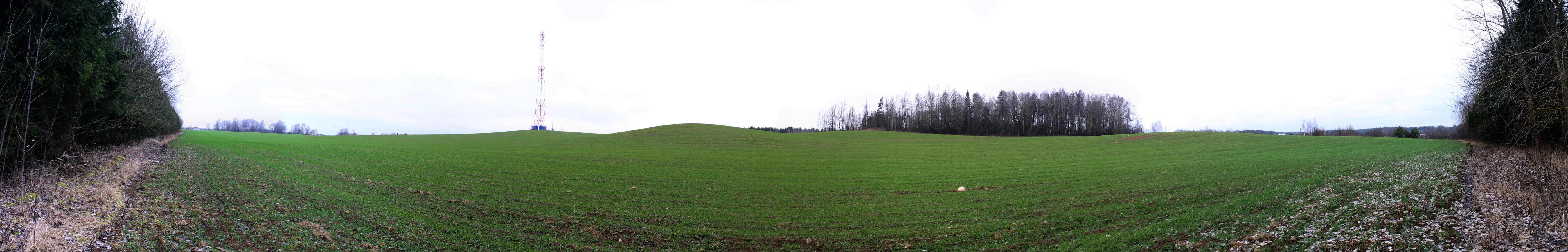 С северной стороны от шоссе было ещё одно холмистое поле с сотовой вышкой. За лесом находится та самая ст. Дубравы. Панорама 180o поля южнее ст. Дубравы. Вид на север. Точка PS4.