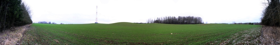 Я забрался на небольшой "курган" на вершине поля (точка 280.4 м), откуда открывалась завораживающая панорама окрестностей. Дул довольно сильный пронизывающий ветер, но место это долго не отпускало меня, все хотелось смотреть и смотреть на уходящий холмами горизонт, покрытый клочками леса. Это поле получило обозначение PS. Панорама 360o поля PS. Центр на восток. Точка PS5.