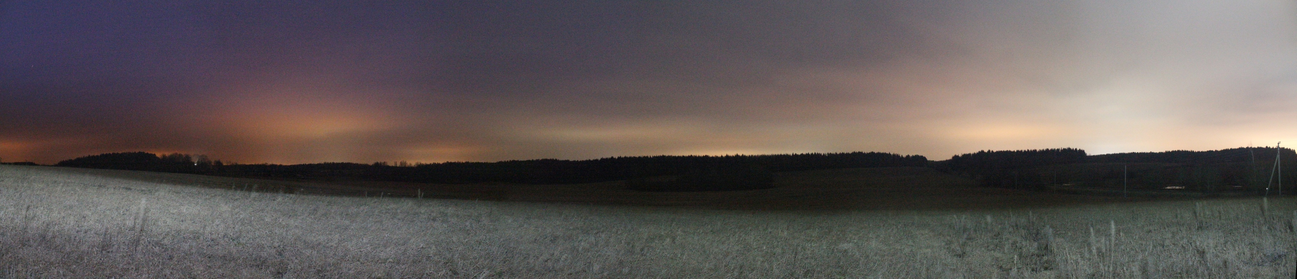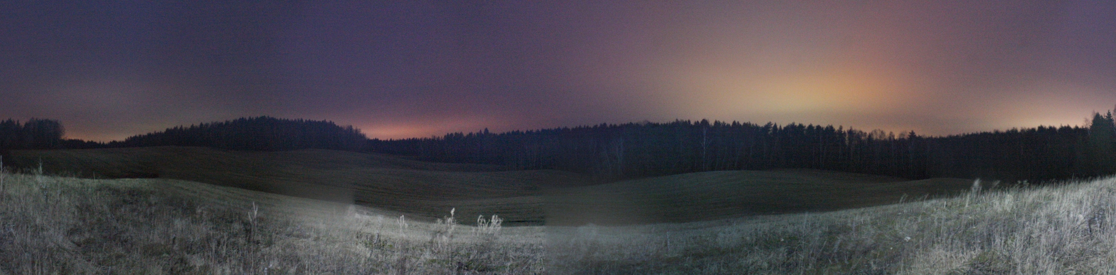 Было уже 18:30, и сумерки сгустились настолько, что для съёмки третьей поляны в 500 м от второй я был вынужден для каждого кадра делать экспозицию по 10 с при ISO3200. Панорама третьей лесной поляны, вид на север. Точка PS10.